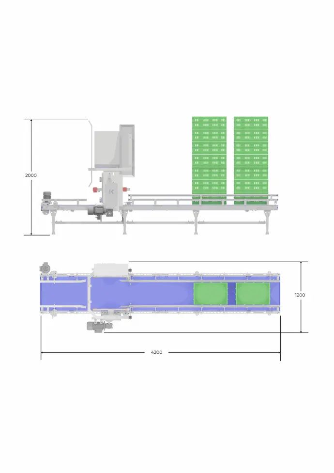 Paletizador cartesiano de dos ejes montado sobre track, posibilitando trabajar en dos posiciones de paletizado diferentes y así maximizar el rendimiento. El producto se deriva automáticamente a la zona de paletización activa, consiguiendo una producción 100% continua.